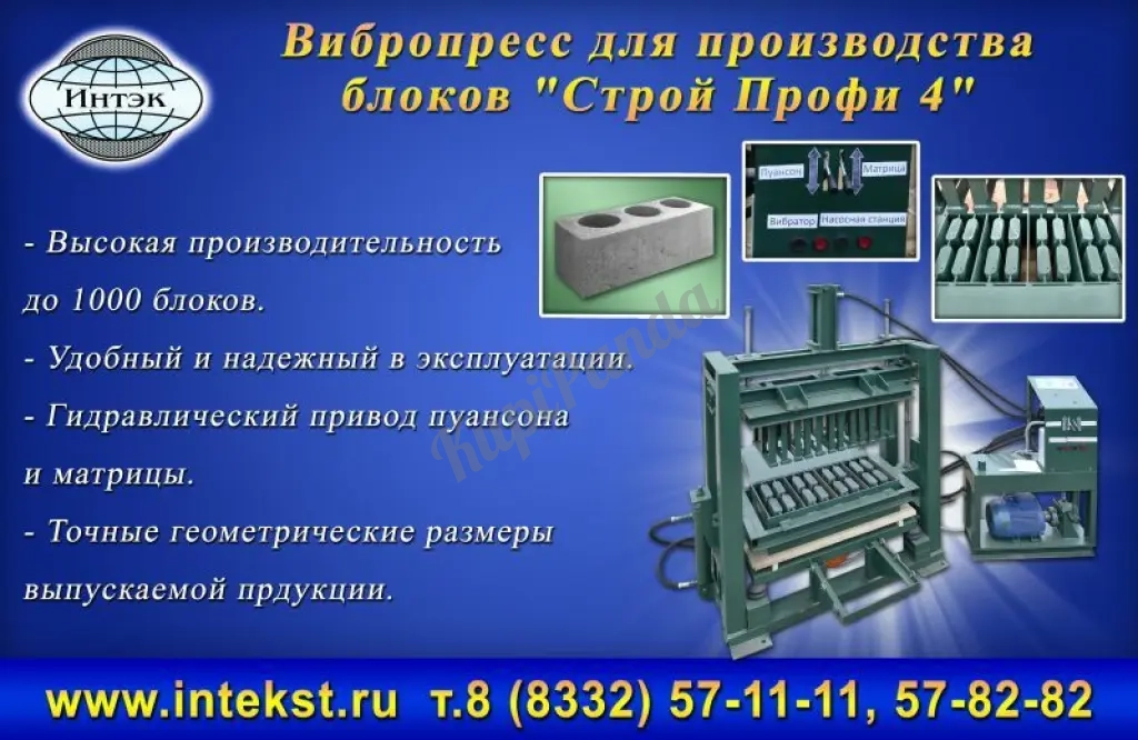 Станки вибропресс работают под напряжением 380 В, при этом мощность электроприводов вибропресса составляет 3,1 кВт. Вибропресс для блоков отличается компактными размерами (при весе в 500 кг габариты станка составляют 230*110*165 см), поэтому под весь производственный процесс достаточно будет отвести площадь в 15-20 кв.м. При необходимости вибропресс для блоков легко можно транспортировать с одного строительного объекта на другой, что делает его максимально удобным. Вместо стандартных амортизационных пружин станки вибропресс оснащены инновационной системой резиновых подушек – это дает возможность существенно снизить шумовой эффект от работы вибратора.8-912-700-67-31