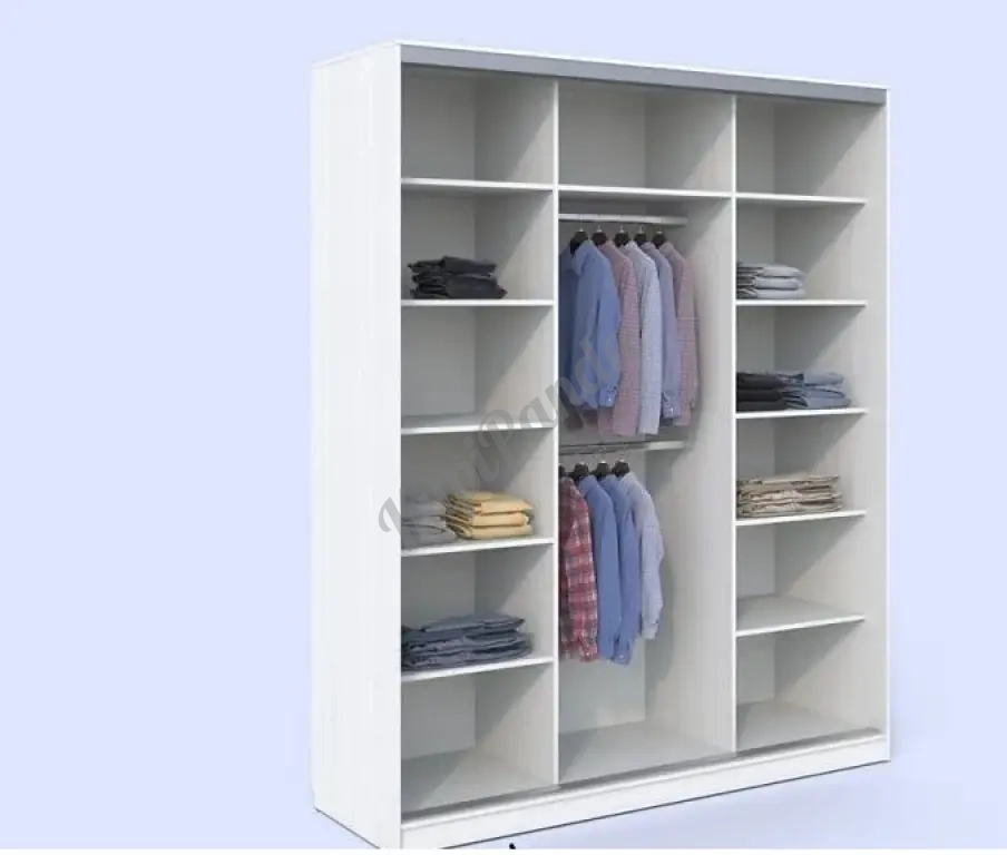 4. Шкаф-купе Леди 3-1 — настоящая доминанта хранения в детской комнате. Внутри шкафа: пять вместительных полок слева и справа. По центру - платяной шкаф. В таком шкафу разместятся все вещи: и мелкие, и крупные. Большое зеркало разбавляет внешний вид шкафа и наполняет пространство дополнительным светом и объемом за счет отражения.