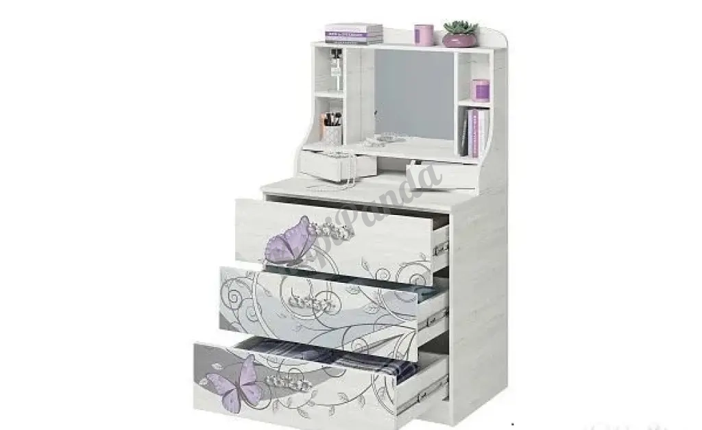 Комод имеет три широких и вместительных ящика для хранения вещей. Принт на фасадах и блестящая фурнитура точно понравятся вашей малышке. Туалетный столик оборудован зеркалом, открытыми нишами и двумя поворотными ящиками.