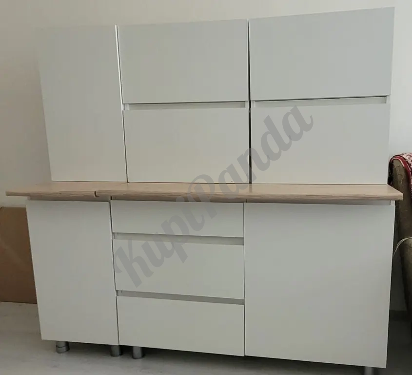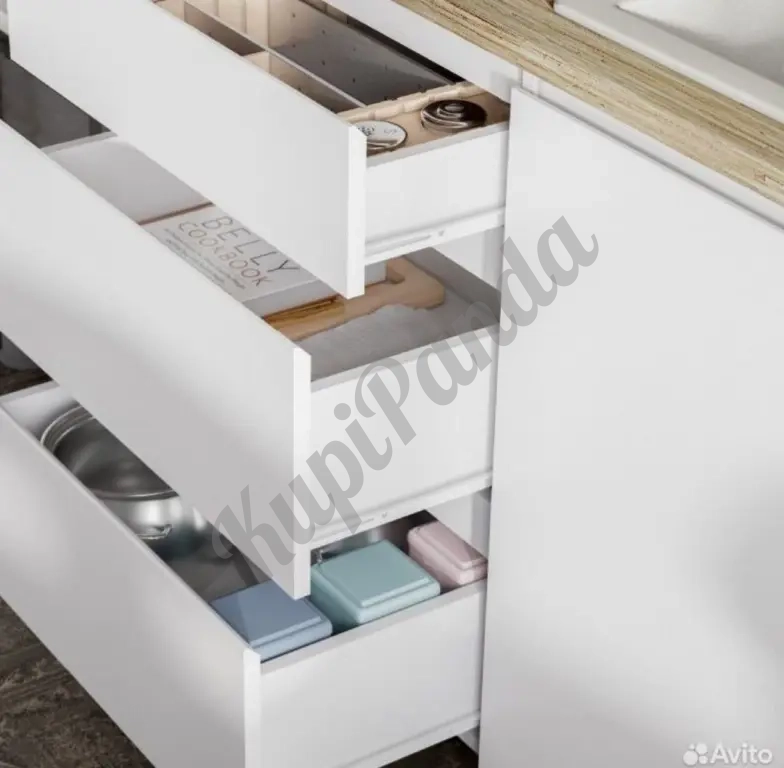 Основная часть (120 см): 3 вместительных выдвижных ящика слева и широкое отделение с дверцей справа (подходит для мойки, есть место под коммуникации)