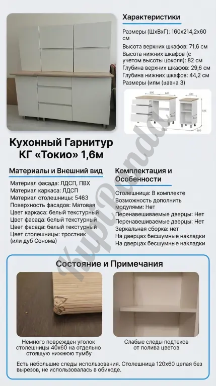 Минимальные следы эксплуатации: слабые потёки внутри одного шкафа (от полива цветов, см. фото), скол угла у малой столешницы (см. фото)